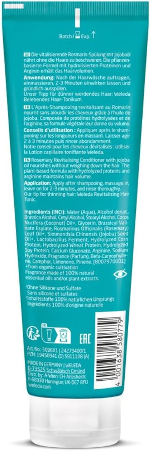 El Acondicionador Revitalizante de Romero Weleda es un tratamiento natural que ayuda a desenredar y suavizar el cabello, dejándolo manejable y con un brillo saludable. Su fórmula ligera combina el poder del romero con aceites vegetales de coco y jojoba, aportando nutrición sin apelmazar, mientras que las proteínas vegetales fortalecen la fibra capilar y mejoran su elasticidad.