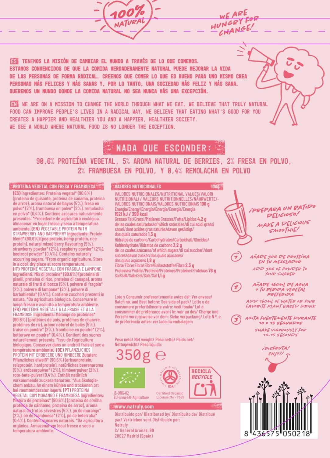Su sabor natural a frambuesa y fresa aporta un toque dulce y afrutado, sin necesidad de azúcares añadidos ni edulcorantes artificiales. Además, esta proteína es libre de gluten y lactosa, y no contiene aditivos, por lo que resulta una opción limpia, nutritiva y apta para dietas veganas.